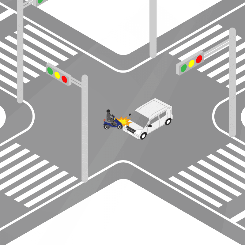・イラストに使用している各要素(車、背景、車、天候、信号、衝突地点など)は、代表的なイメージをイラスト化しており、色や形状等含め現実の事故の状況とは異なります。あくまで、事故のイメージとして参考までにご活用ください。