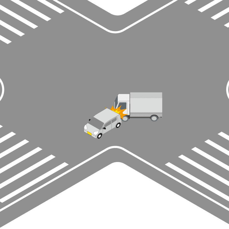 ・イラストに使用している各要素(車、背景、車、天候、信号、衝突地点など)は、代表的なイメージをイラスト化しており、色や形状等含め現実の事故の状況とは異なります。あくまで、事故のイメージとして参考までにご活用ください。