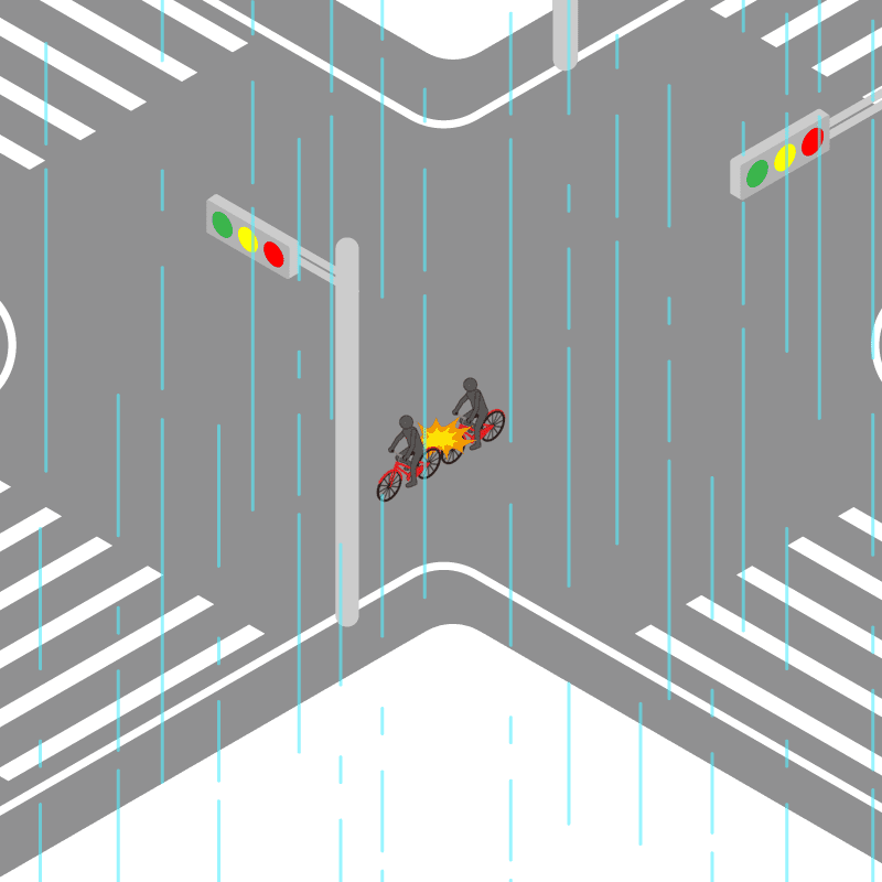 ・イラストに使用している各要素(車、背景、車、天候、信号、衝突地点など)は、代表的なイメージをイラスト化しており、色や形状等含め現実の事故の状況とは異なります。あくまで、事故のイメージとして参考までにご活用ください。