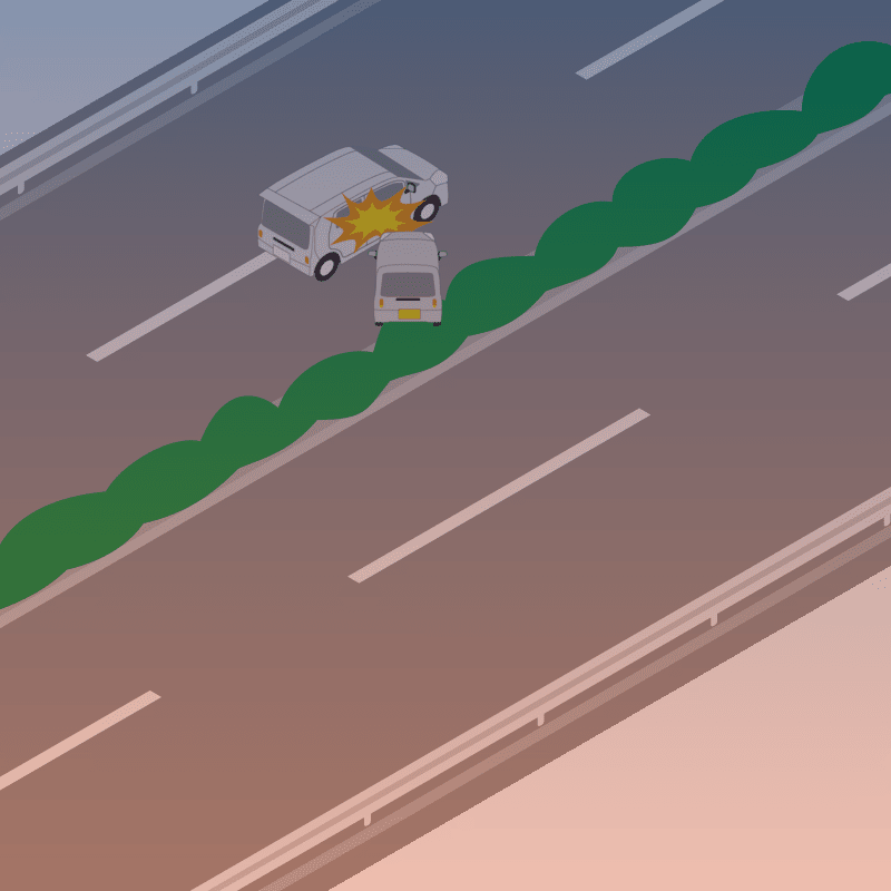 ・イラストに使用している各要素(車、背景、車、天候、信号、衝突地点など)は、代表的なイメージをイラスト化しており、色や形状等含め現実の事故の状況とは異なります。あくまで、事故のイメージとして参考までにご活用ください。