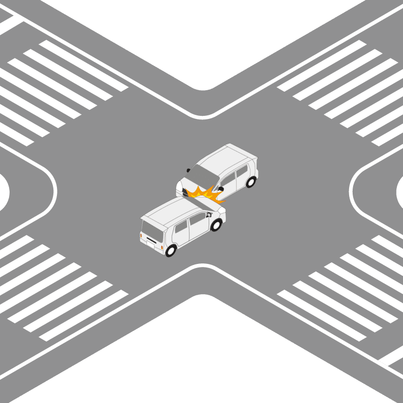・イラストに使用している各要素(車、背景、車、天候、信号、衝突地点など)は、代表的なイメージをイラスト化しており、色や形状等含め現実の事故の状況とは異なります。あくまで、事故のイメージとして参考までにご活用ください。