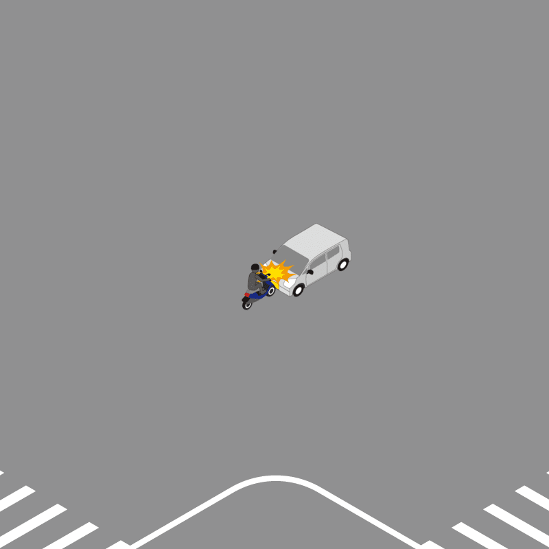・イラストに使用している各要素(車、背景、車、天候、信号、衝突地点など)は、代表的なイメージをイラスト化しており、色や形状等含め現実の事故の状況とは異なります。あくまで、事故のイメージとして参考までにご活用ください。