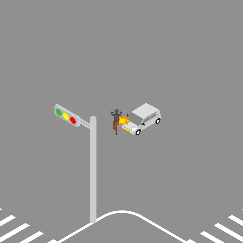 ・イラストに使用している各要素(車、背景、車、天候、信号、衝突地点など)は、代表的なイメージをイラスト化しており、色や形状等含め現実の事故の状況とは異なります。あくまで、事故のイメージとして参考までにご活用ください。
