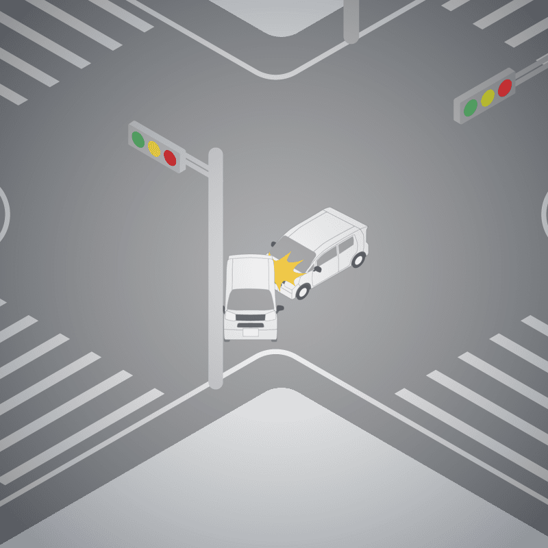 ・イラストに使用している各要素(車、背景、車、天候、信号、衝突地点など)は、代表的なイメージをイラスト化しており、色や形状等含め現実の事故の状況とは異なります。あくまで、事故のイメージとして参考までにご活用ください。