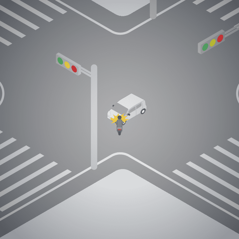 ・イラストに使用している各要素(車、背景、車、天候、信号、衝突地点など)は、代表的なイメージをイラスト化しており、色や形状等含め現実の事故の状況とは異なります。あくまで、事故のイメージとして参考までにご活用ください。