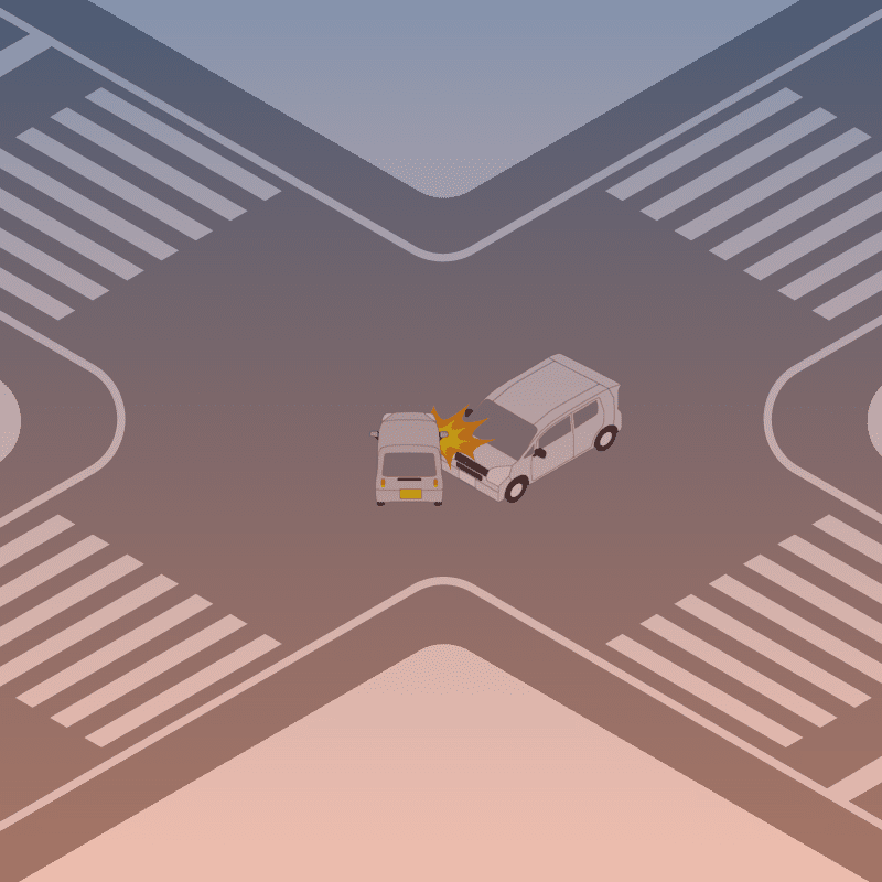 ・イラストに使用している各要素(車、背景、車、天候、信号、衝突地点など)は、代表的なイメージをイラスト化しており、色や形状等含め現実の事故の状況とは異なります。あくまで、事故のイメージとして参考までにご活用ください。