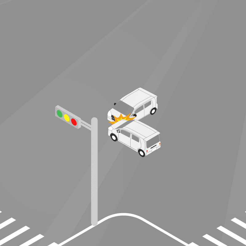 ・イラストに使用している各要素(車、背景、車、天候、信号、衝突地点など)は、代表的なイメージをイラスト化しており、色や形状等含め現実の事故の状況とは異なります。あくまで、事故のイメージとして参考までにご活用ください。