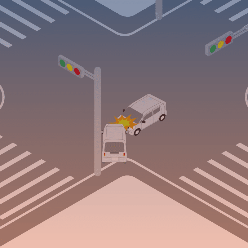 ・イラストに使用している各要素(車、背景、車、天候、信号、衝突地点など)は、代表的なイメージをイラスト化しており、色や形状等含め現実の事故の状況とは異なります。あくまで、事故のイメージとして参考までにご活用ください。