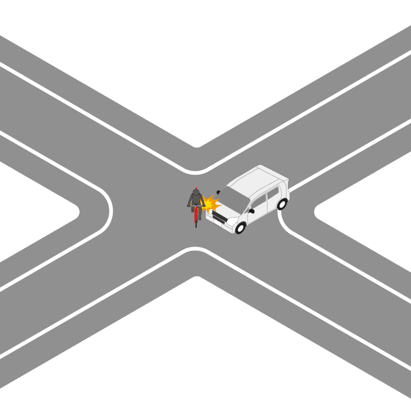・イラストに使用している各要素(車、背景、車、天候、信号、衝突地点など)は、代表的なイメージをイラスト化しており、色や形状等含め現実の事故の状況とは異なります。あくまで、事故のイメージとして参考までにご活用ください。