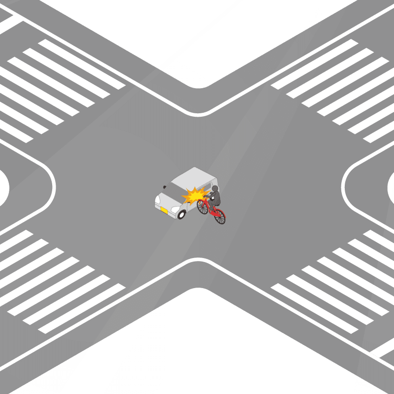 ・イラストに使用している各要素(車、背景、車、天候、信号、衝突地点など)は、代表的なイメージをイラスト化しており、色や形状等含め現実の事故の状況とは異なります。あくまで、事故のイメージとして参考までにご活用ください。