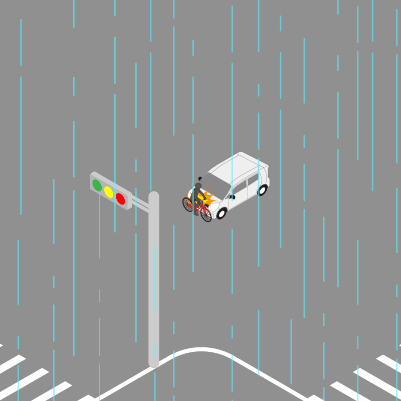 ・イラストに使用している各要素(車、背景、車、天候、信号、衝突地点など)は、代表的なイメージをイラスト化しており、色や形状等含め現実の事故の状況とは異なります。あくまで、事故のイメージとして参考までにご活用ください。