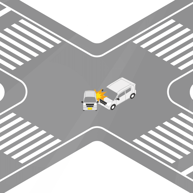 ・イラストに使用している各要素(車、背景、車、天候、信号、衝突地点など)は、代表的なイメージをイラスト化しており、色や形状等含め現実の事故の状況とは異なります。あくまで、事故のイメージとして参考までにご活用ください。