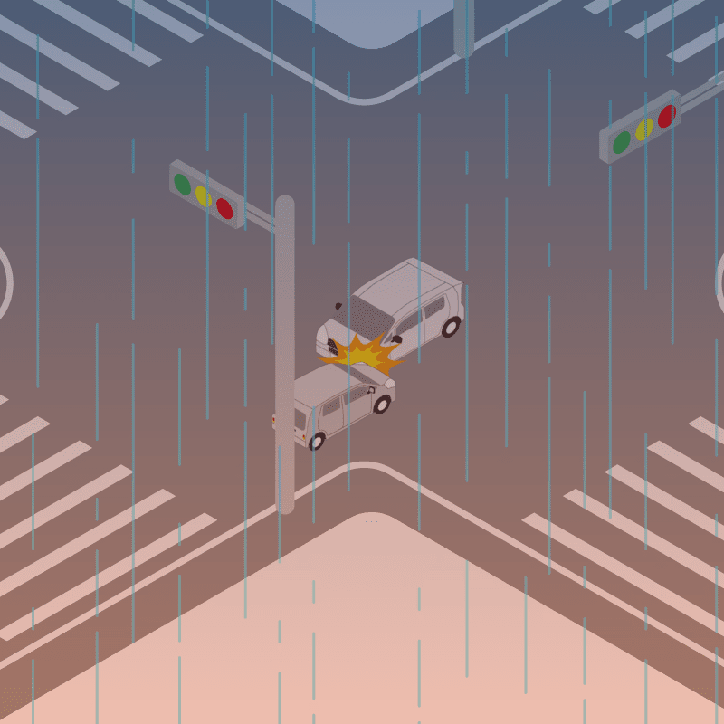 ・イラストに使用している各要素(車、背景、車、天候、信号、衝突地点など)は、代表的なイメージをイラスト化しており、色や形状等含め現実の事故の状況とは異なります。あくまで、事故のイメージとして参考までにご活用ください。