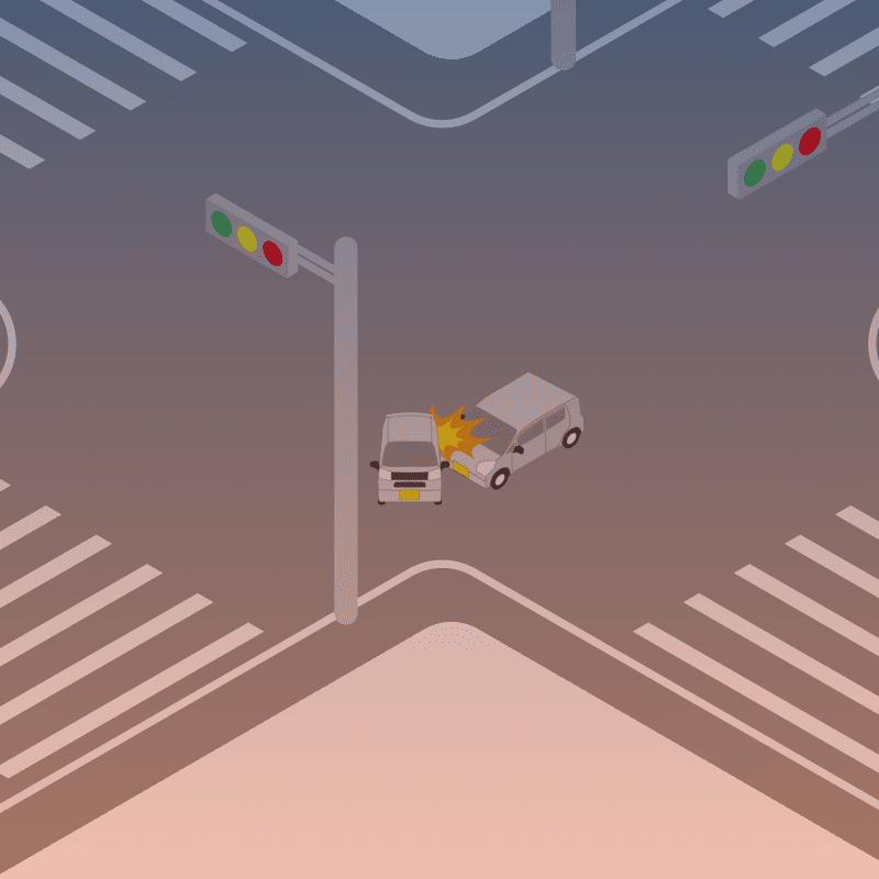 ・イラストに使用している各要素(車、背景、車、天候、信号、衝突地点など)は、代表的なイメージをイラスト化しており、色や形状等含め現実の事故の状況とは異なります。あくまで、事故のイメージとして参考までにご活用ください。