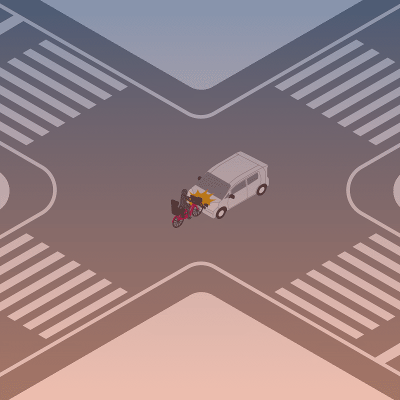 ・イラストに使用している各要素(車、背景、車、天候、信号、衝突地点など)は、代表的なイメージをイラスト化しており、色や形状等含め現実の事故の状況とは異なります。あくまで、事故のイメージとして参考までにご活用ください。