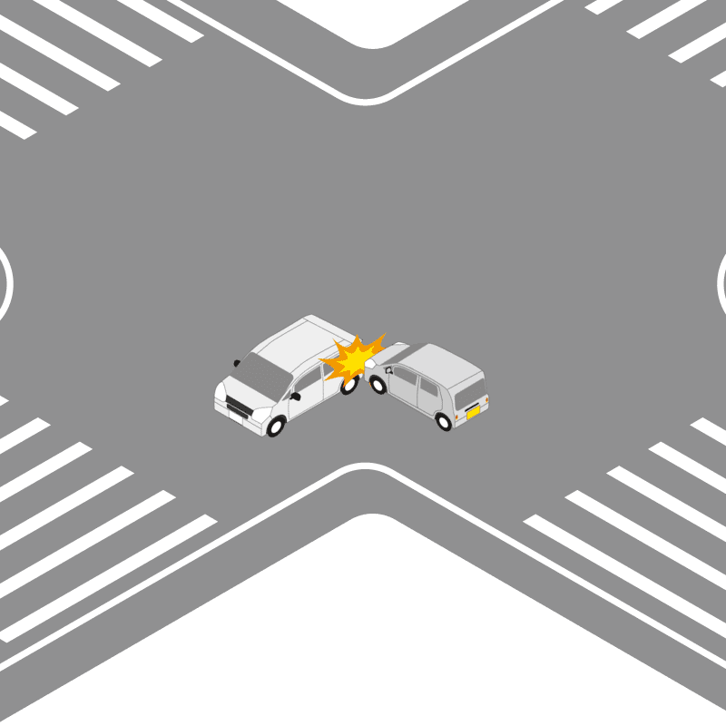 ・イラストに使用している各要素(車、背景、車、天候、信号、衝突地点など)は、代表的なイメージをイラスト化しており、色や形状等含め現実の事故の状況とは異なります。あくまで、事故のイメージとして参考までにご活用ください。