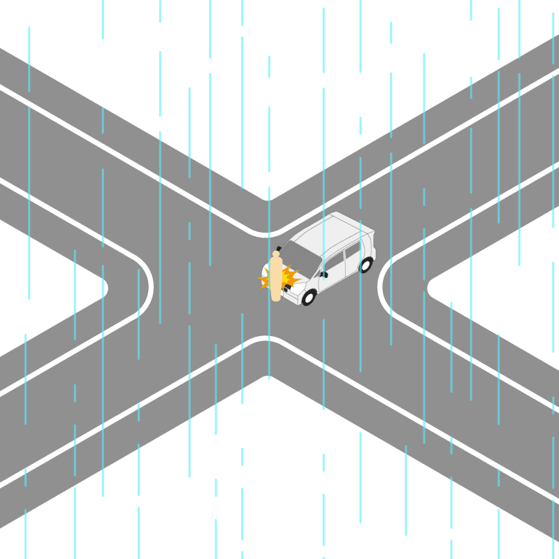 ・イラストに使用している各要素(車、背景、車、天候、信号、衝突地点など)は、代表的なイメージをイラスト化しており、色や形状等含め現実の事故の状況とは異なります。あくまで、事故のイメージとして参考までにご活用ください。