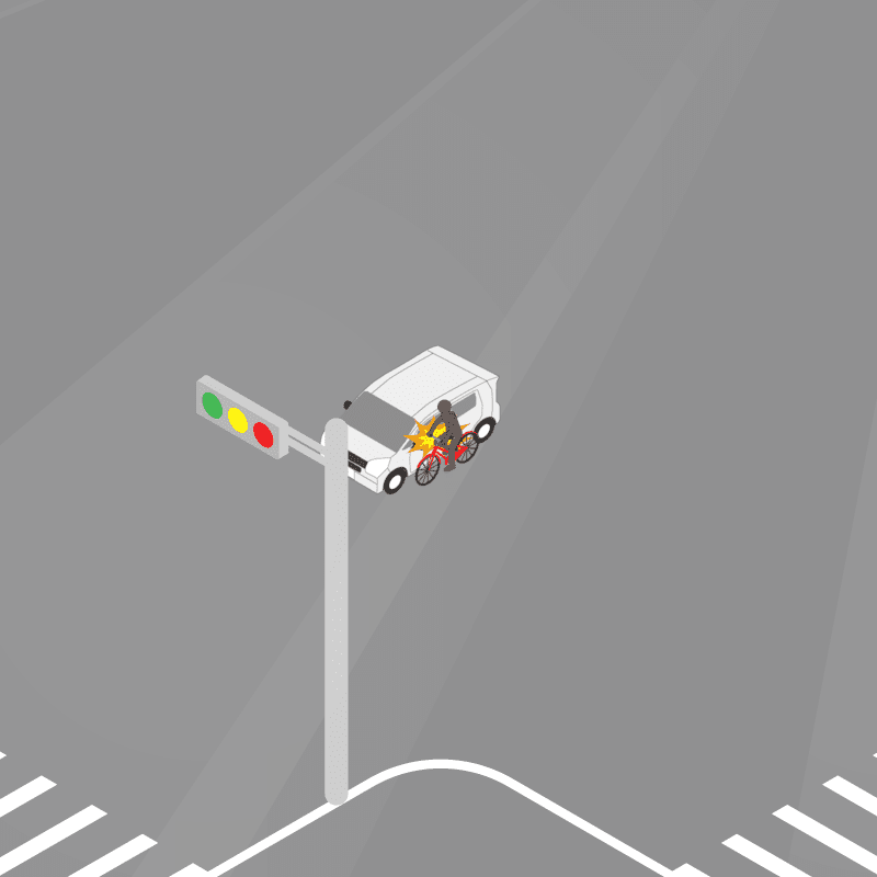 ・イラストに使用している各要素(車、背景、車、天候、信号、衝突地点など)は、代表的なイメージをイラスト化しており、色や形状等含め現実の事故の状況とは異なります。あくまで、事故のイメージとして参考までにご活用ください。