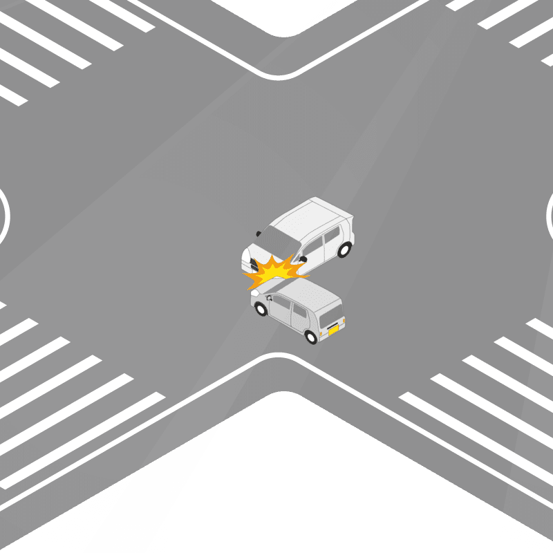 ・イラストに使用している各要素(車、背景、車、天候、信号、衝突地点など)は、代表的なイメージをイラスト化しており、色や形状等含め現実の事故の状況とは異なります。あくまで、事故のイメージとして参考までにご活用ください。