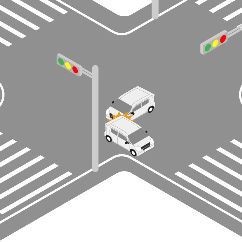 ・イラストに使用している各要素(車、背景、車、天候、信号、衝突地点など)は、代表的なイメージをイラスト化しており、色や形状等含め現実の事故の状況とは異なります。あくまで、事故のイメージとして参考までにご活用ください。
