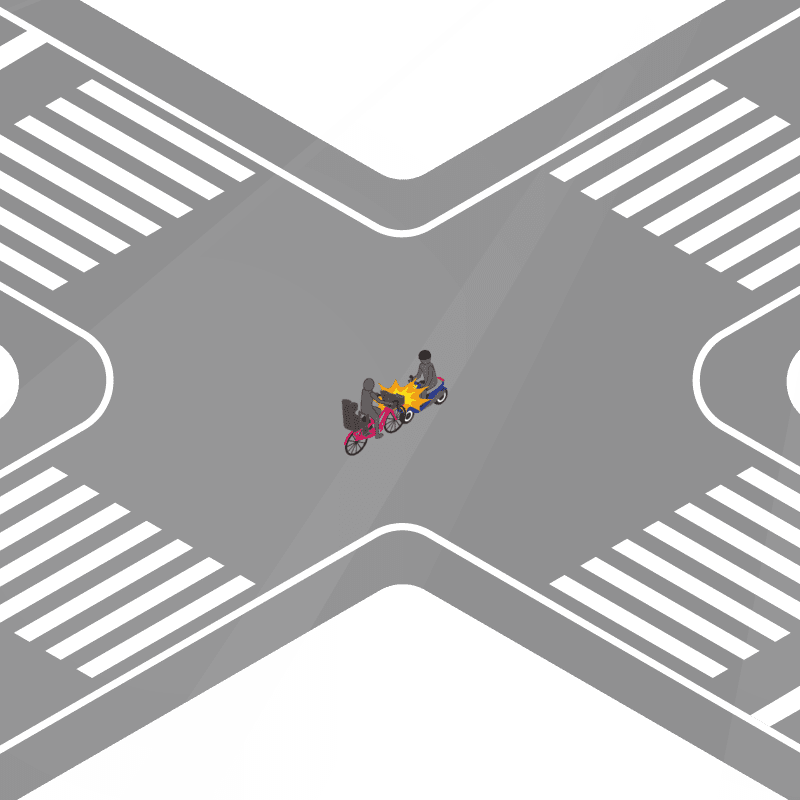 ・イラストに使用している各要素(車、背景、車、天候、信号、衝突地点など)は、代表的なイメージをイラスト化しており、色や形状等含め現実の事故の状況とは異なります。あくまで、事故のイメージとして参考までにご活用ください。