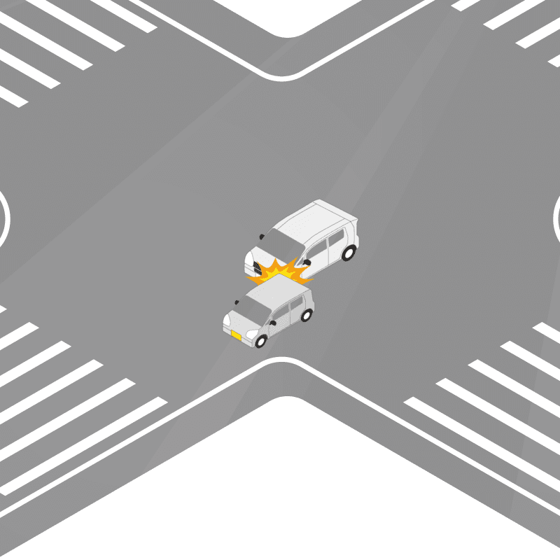 ・イラストに使用している各要素(車、背景、車、天候、信号、衝突地点など)は、代表的なイメージをイラスト化しており、色や形状等含め現実の事故の状況とは異なります。あくまで、事故のイメージとして参考までにご活用ください。