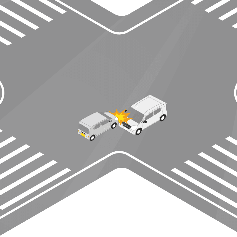 ・イラストに使用している各要素(車、背景、車、天候、信号、衝突地点など)は、代表的なイメージをイラスト化しており、色や形状等含め現実の事故の状況とは異なります。あくまで、事故のイメージとして参考までにご活用ください。
