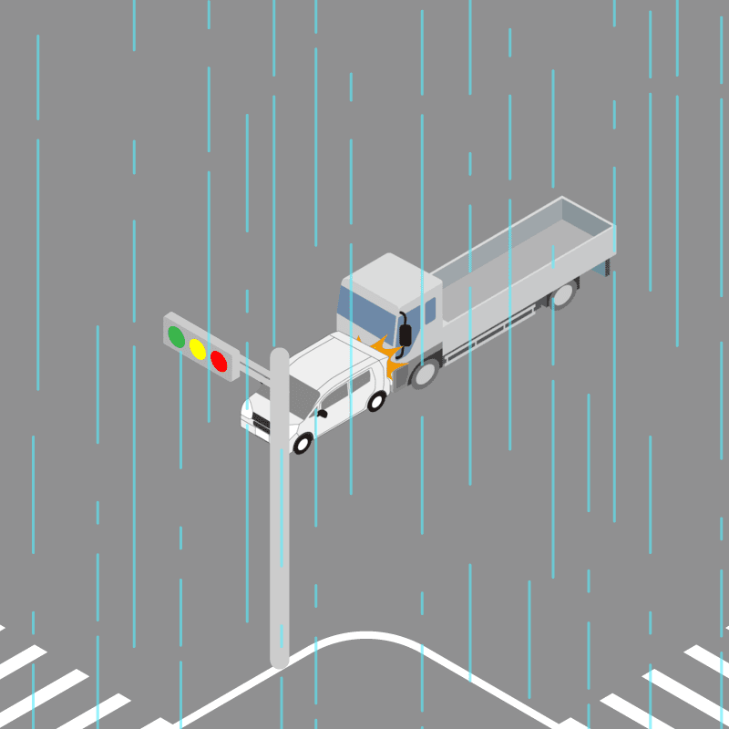 ・イラストに使用している各要素(車、背景、車、天候、信号、衝突地点など)は、代表的なイメージをイラスト化しており、色や形状等含め現実の事故の状況とは異なります。あくまで、事故のイメージとして参考までにご活用ください。