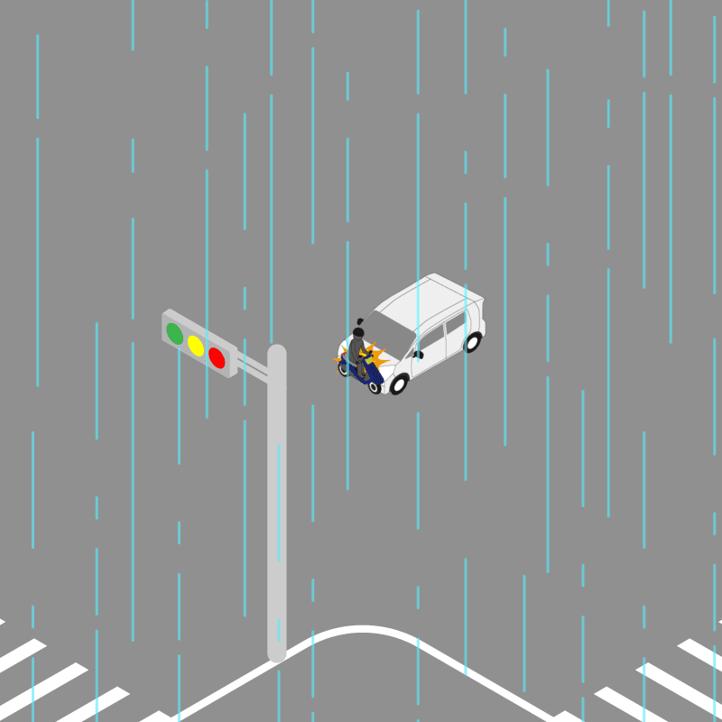 ・イラストに使用している各要素(車、背景、車、天候、信号、衝突地点など)は、代表的なイメージをイラスト化しており、色や形状等含め現実の事故の状況とは異なります。あくまで、事故のイメージとして参考までにご活用ください。