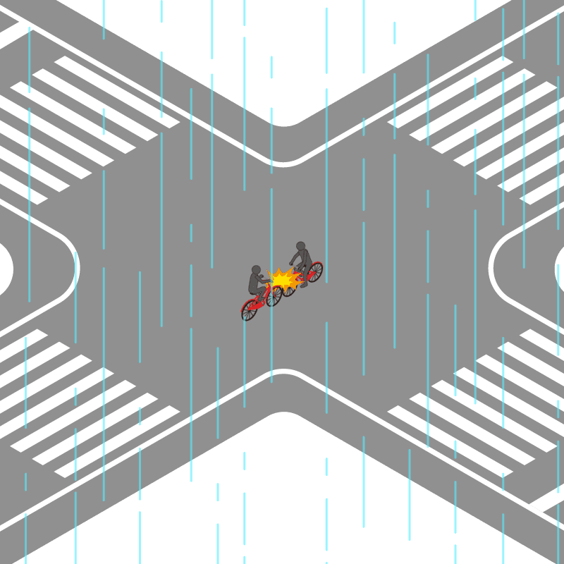 ・イラストに使用している各要素(車、背景、車、天候、信号、衝突地点など)は、代表的なイメージをイラスト化しており、色や形状等含め現実の事故の状況とは異なります。あくまで、事故のイメージとして参考までにご活用ください。