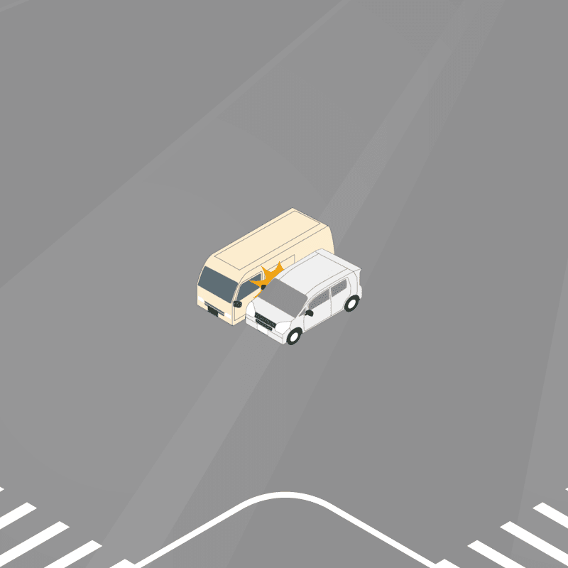 ・イラストに使用している各要素(車、背景、車、天候、信号、衝突地点など)は、代表的なイメージをイラスト化しており、色や形状等含め現実の事故の状況とは異なります。あくまで、事故のイメージとして参考までにご活用ください。