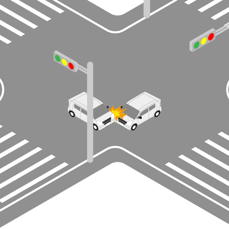 ・イラストに使用している各要素(車、背景、車、天候、信号、衝突地点など)は、代表的なイメージをイラスト化しており、色や形状等含め現実の事故の状況とは異なります。あくまで、事故のイメージとして参考までにご活用ください。