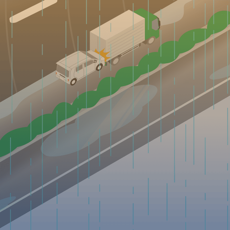 ・イラストに使用している各要素(車、背景、車、天候、信号、衝突地点など)は、代表的なイメージをイラスト化しており、色や形状等含め現実の事故の状況とは異なります。あくまで、事故のイメージとして参考までにご活用ください。