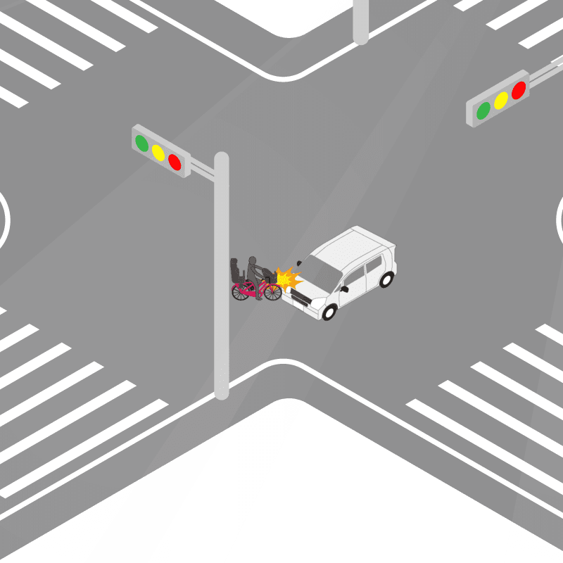 ・イラストに使用している各要素(車、背景、車、天候、信号、衝突地点など)は、代表的なイメージをイラスト化しており、色や形状等含め現実の事故の状況とは異なります。あくまで、事故のイメージとして参考までにご活用ください。