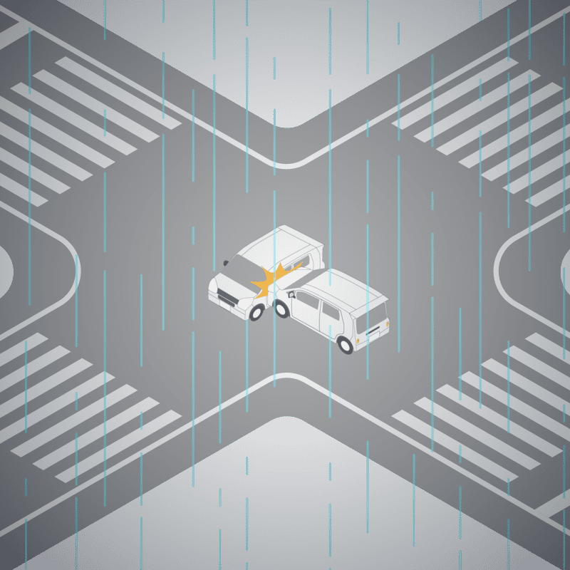 ・イラストに使用している各要素(車、背景、車、天候、信号、衝突地点など)は、代表的なイメージをイラスト化しており、色や形状等含め現実の事故の状況とは異なります。あくまで、事故のイメージとして参考までにご活用ください。