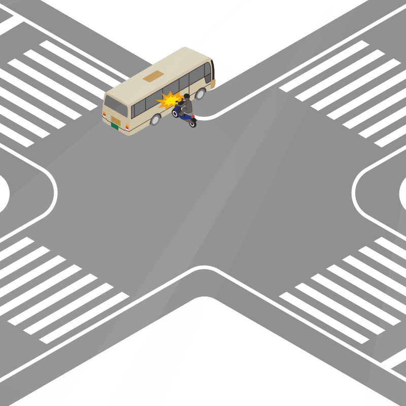 ・イラストに使用している各要素(車、背景、車、天候、信号、衝突地点など)は、代表的なイメージをイラスト化しており、色や形状等含め現実の事故の状況とは異なります。あくまで、事故のイメージとして参考までにご活用ください。