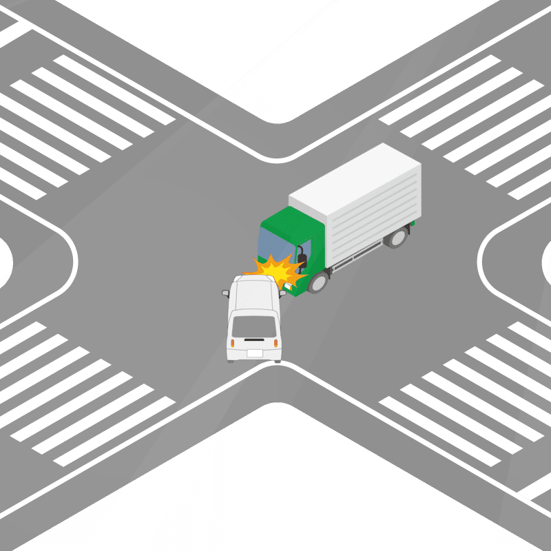 ・イラストに使用している各要素(車、背景、車、天候、信号、衝突地点など)は、代表的なイメージをイラスト化しており、色や形状等含め現実の事故の状況とは異なります。あくまで、事故のイメージとして参考までにご活用ください。