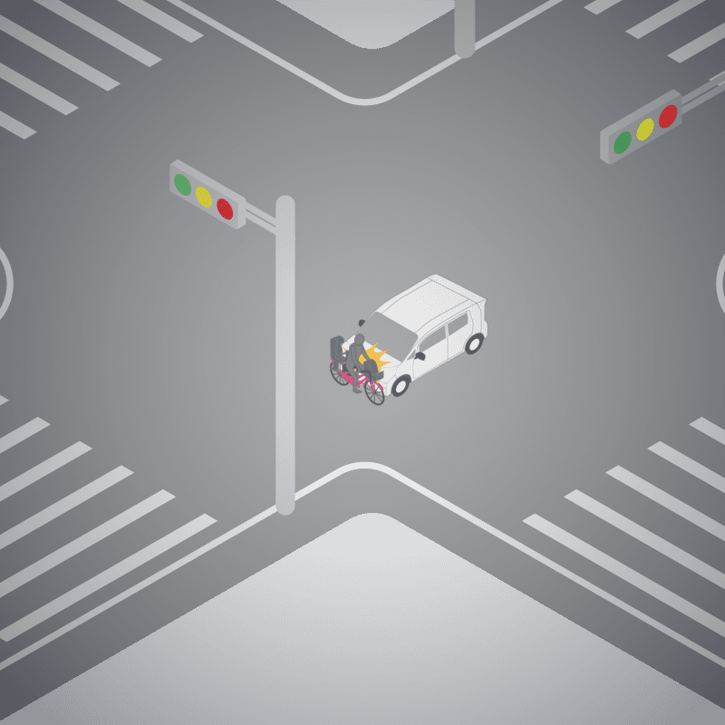 ・イラストに使用している各要素(車、背景、車、天候、信号、衝突地点など)は、代表的なイメージをイラスト化しており、色や形状等含め現実の事故の状況とは異なります。あくまで、事故のイメージとして参考までにご活用ください。