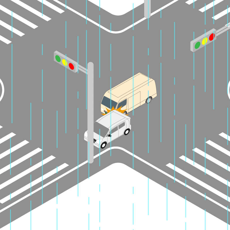 ・イラストに使用している各要素(車、背景、車、天候、信号、衝突地点など)は、代表的なイメージをイラスト化しており、色や形状等含め現実の事故の状況とは異なります。あくまで、事故のイメージとして参考までにご活用ください。