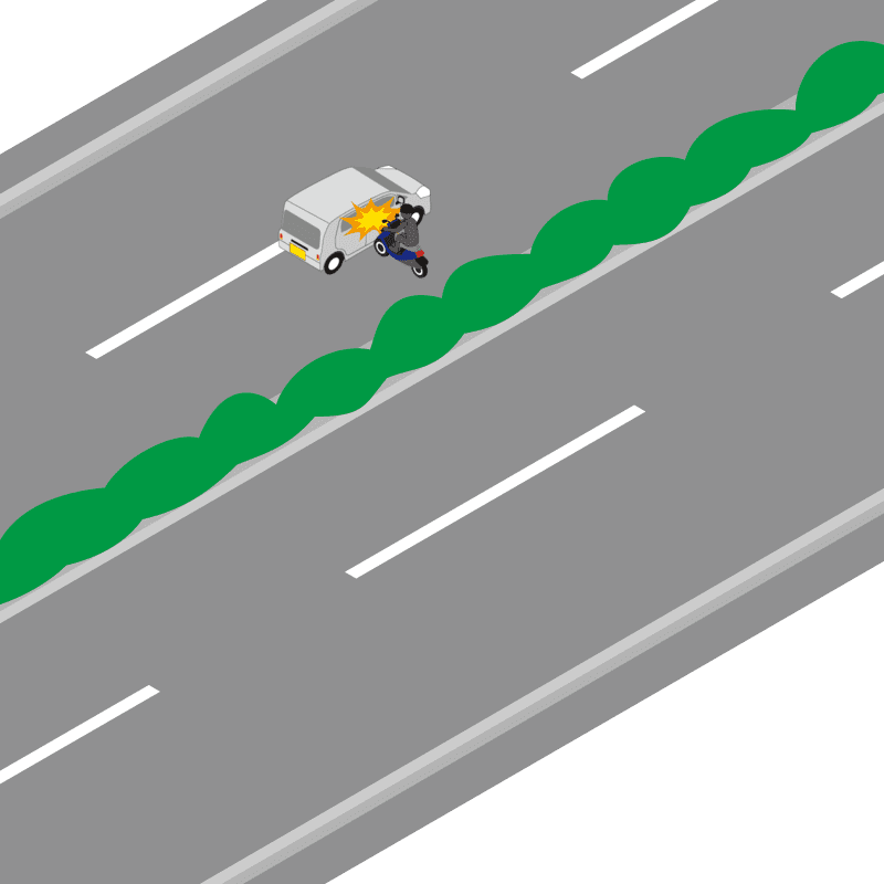 ・イラストに使用している各要素(車、背景、車、天候、信号、衝突地点など)は、代表的なイメージをイラスト化しており、色や形状等含め現実の事故の状況とは異なります。あくまで、事故のイメージとして参考までにご活用ください。