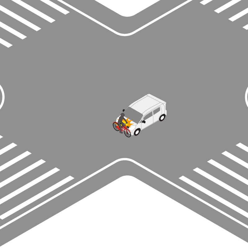・イラストに使用している各要素(車、背景、車、天候、信号、衝突地点など)は、代表的なイメージをイラスト化しており、色や形状等含め現実の事故の状況とは異なります。あくまで、事故のイメージとして参考までにご活用ください。