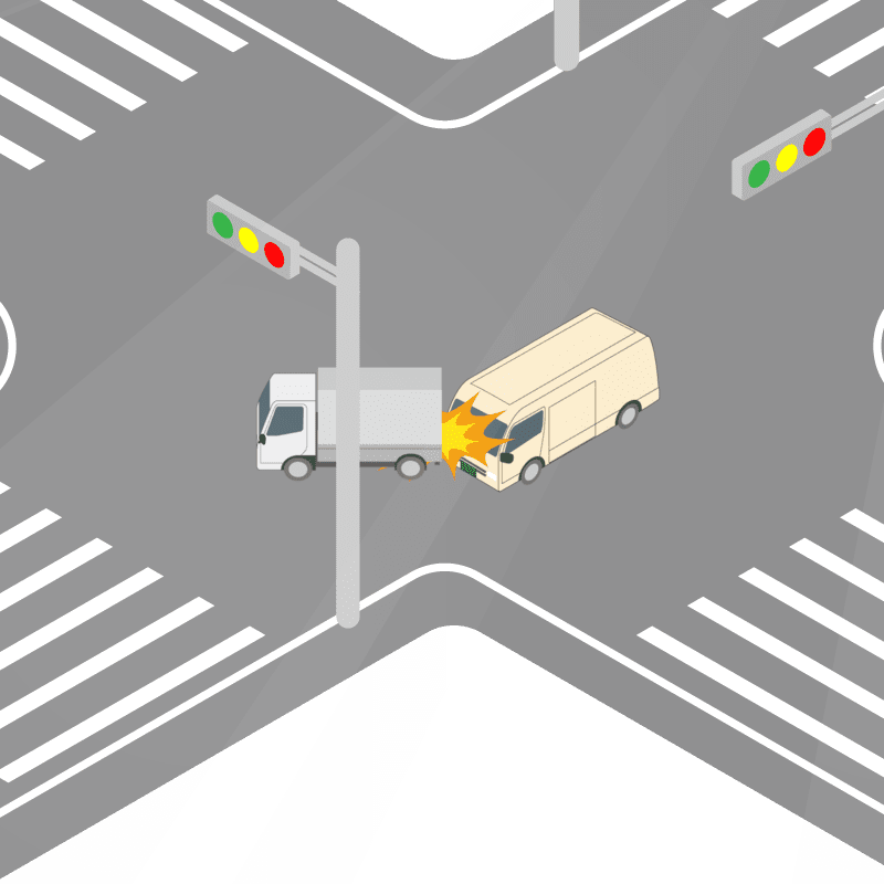 ・イラストに使用している各要素(車、背景、車、天候、信号、衝突地点など)は、代表的なイメージをイラスト化しており、色や形状等含め現実の事故の状況とは異なります。あくまで、事故のイメージとして参考までにご活用ください。
