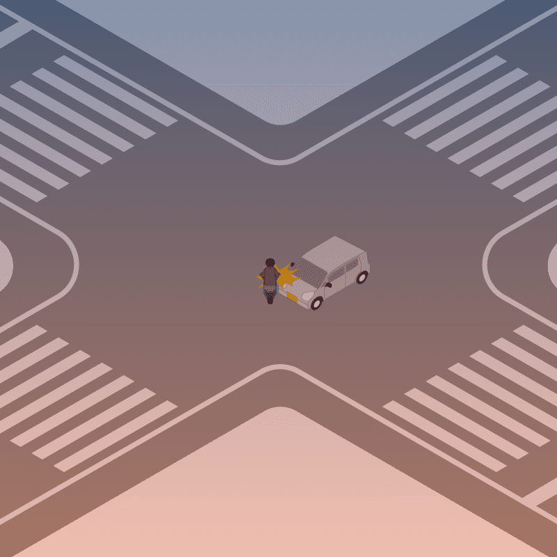 ・イラストに使用している各要素(車、背景、車、天候、信号、衝突地点など)は、代表的なイメージをイラスト化しており、色や形状等含め現実の事故の状況とは異なります。あくまで、事故のイメージとして参考までにご活用ください。