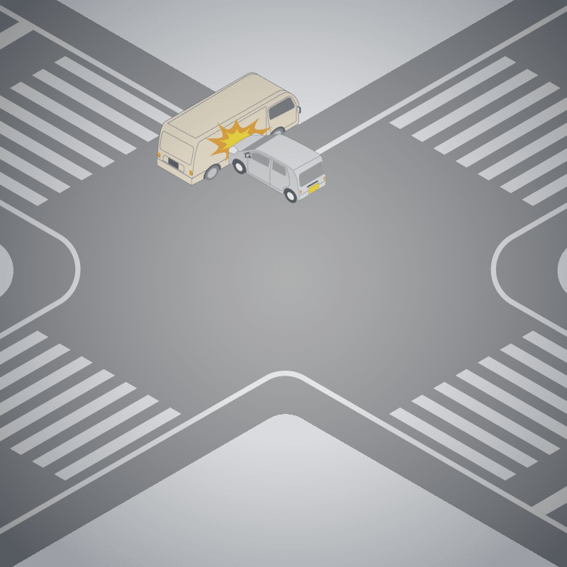 ・イラストに使用している各要素(車、背景、車、天候、信号、衝突地点など)は、代表的なイメージをイラスト化しており、色や形状等含め現実の事故の状況とは異なります。あくまで、事故のイメージとして参考までにご活用ください。