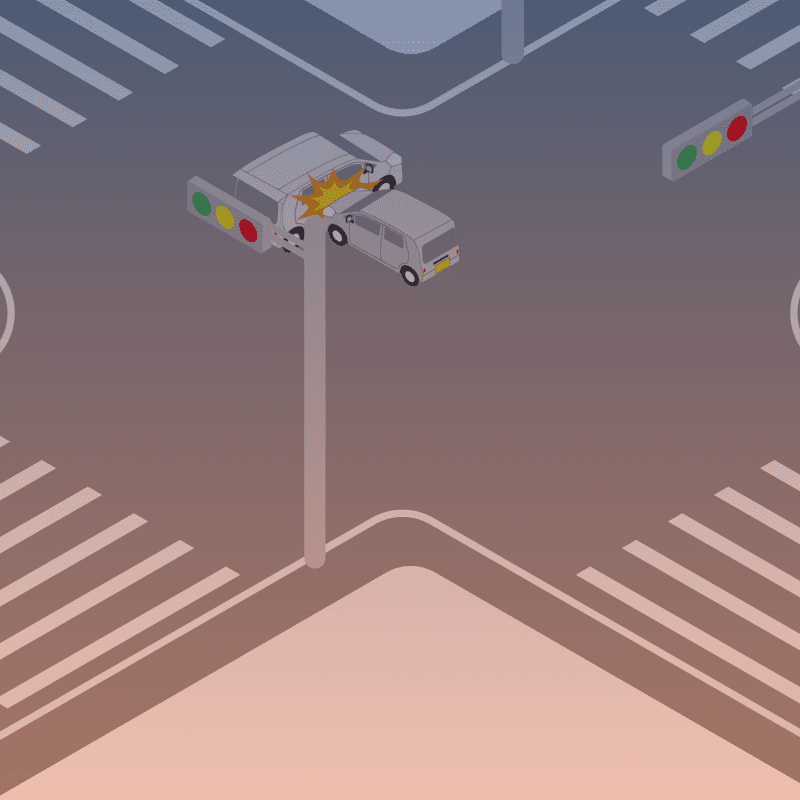 ・イラストに使用している各要素(車、背景、車、天候、信号、衝突地点など)は、代表的なイメージをイラスト化しており、色や形状等含め現実の事故の状況とは異なります。あくまで、事故のイメージとして参考までにご活用ください。