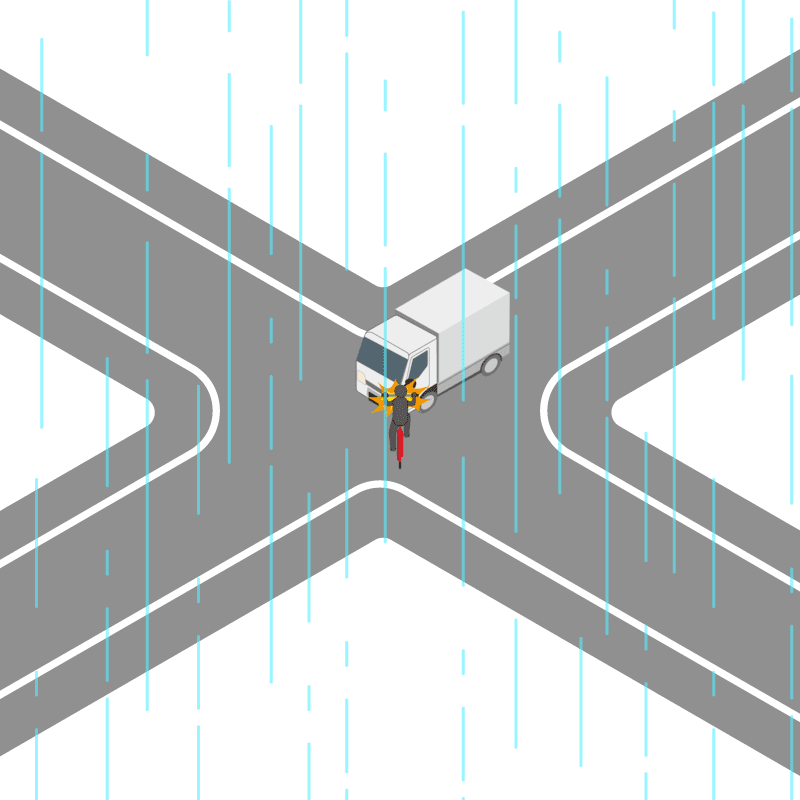 ・イラストに使用している各要素(車、背景、車、天候、信号、衝突地点など)は、代表的なイメージをイラスト化しており、色や形状等含め現実の事故の状況とは異なります。あくまで、事故のイメージとして参考までにご活用ください。