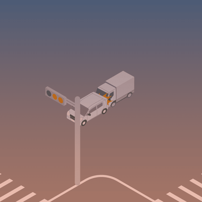・イラストに使用している各要素(車、背景、車、天候、信号、衝突地点など)は、代表的なイメージをイラスト化しており、色や形状等含め現実の事故の状況とは異なります。あくまで、事故のイメージとして参考までにご活用ください。