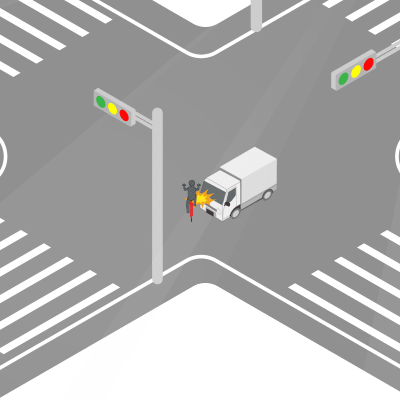 ・イラストに使用している各要素(車、背景、車、天候、信号、衝突地点など)は、代表的なイメージをイラスト化しており、色や形状等含め現実の事故の状況とは異なります。あくまで、事故のイメージとして参考までにご活用ください。