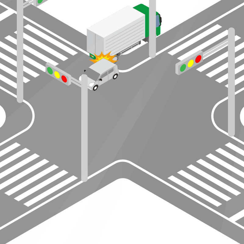 ・イラストに使用している各要素(車、背景、車、天候、信号、衝突地点など)は、代表的なイメージをイラスト化しており、色や形状等含め現実の事故の状況とは異なります。あくまで、事故のイメージとして参考までにご活用ください。