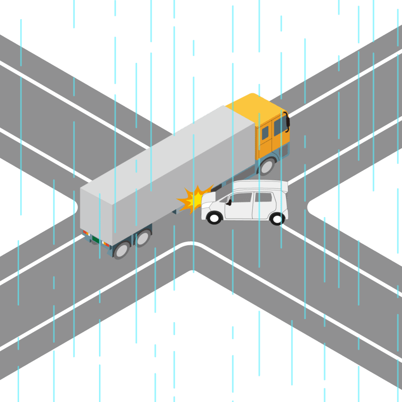 ・イラストに使用している各要素(車、背景、車、天候、信号、衝突地点など)は、代表的なイメージをイラスト化しており、色や形状等含め現実の事故の状況とは異なります。あくまで、事故のイメージとして参考までにご活用ください。